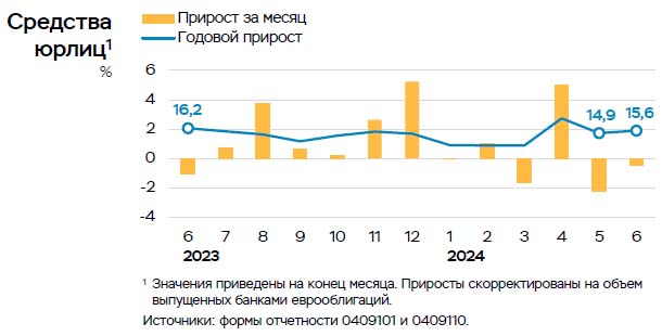 Объем средств юрлиц в банках на конец 1-го полугодия 2024 года составил 53,8 трлн. рублей, рост за период составил всего 1,5%. На графике ниже хорошо заметно, что бОльшая часть оттока произошла в марте и мае. Важная причина оттока – перечисление налогов в бюджет и выплата компаниями дивидендов.