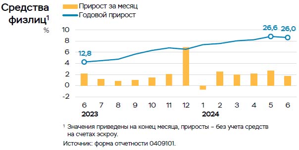 Остаток средств физлиц в банках за 1-е полугодие 2024 года возрос на 10,5% и составил 49,8 трлн. рублей. Это в 2,5 раза превышает прирост за 1-е полугодие 2023 года, когда ставки по вкладам были заметно ниже. По расчетам Центробанка, примерно треть прироста частные лица заработали благодаря капитализации процентов по вкладам. Продолжается снижение доли валютных остатков физлиц в банках из-за снятия валютных вкладов, конвертации валюты в рубли и переводов валюты на счета в зарубежных банках.