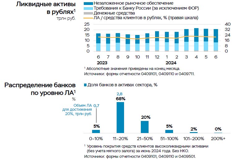По данным Банка России, запас рублевой и валютной ликвидности в банковской системе страны на конец 1-го полугодия 2024 года является достаточным. Но распределен запас ликвидности между банками неравномерно, что хорошо заметно на графике. Запас рублевой ликвидности составил 20,4 трлн. рублей, что достаточно для покрытия 21,4% всех клиентских средств в рублях.