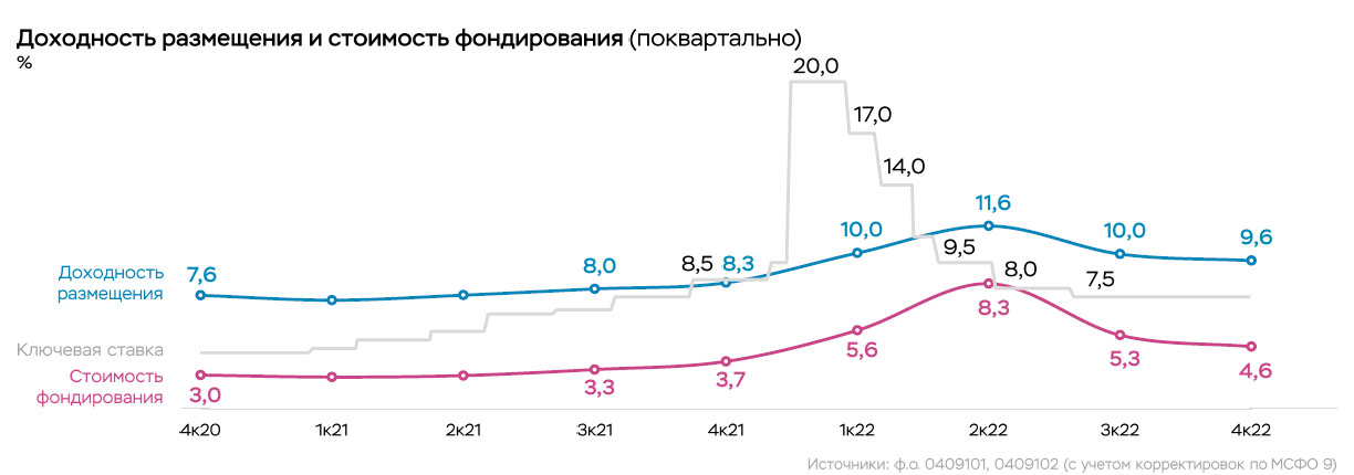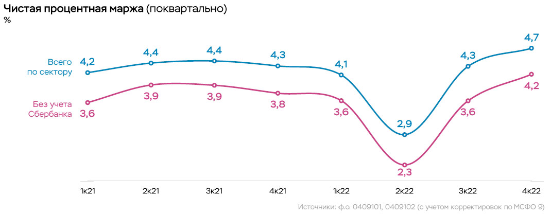 Банковская маржа сжалась во 2 квартале 2022 года во время скачка процентных ставок, но осталась положительной из-за высокой доли дешевых для банков остатков средств на текущих счетах клиентов. А в конце года маржа даже превысила докризисный уровень и составила 4,7% годовых.