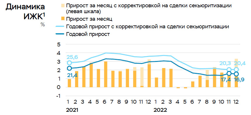 Согласно данным Банка России, за 2022 год объем портфеля ипотечных кредитов физлицам вырос на 20,4% и составил 14,1 трлн. рублей. Это хороший результат, хотя и меньше значения 2021 года, в котором рост ипотечного портфеля составил 31%. В значительной мере росту объема ипотеки способствовали льготные госпрограммы, на которых скачки процентных ставок в 1 полугодии отразились не так сильно.