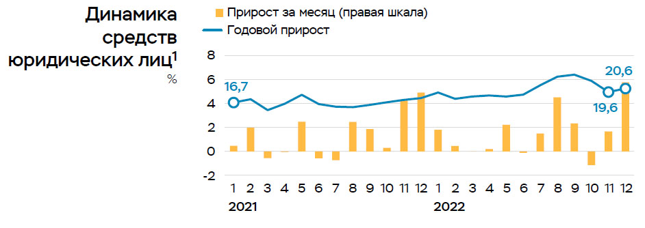 Объем кредитов юрлицам за 2022 год вырос на 14,3% и составил 59,1 трлн. рублей. Рост заметно превысил показатели 2021 года (+11,7%). Это объясняется господдержкой системообразующих предприятий (таких кредитов выдано за 2022 год на 1,5 трлн. рублей), наращиванием проектного финансирования жилищного строительства (+2,2 трлн. рублей), замещением внешних заимствований компаний внутренними, финансированием крупных инвестпроектов. После пика выдач ранее оформленных кредитов в феврале месяце спад в выдачах продолжался до июня. А уже во втором полугодии банки активно наращивали корпоративное кредитование.