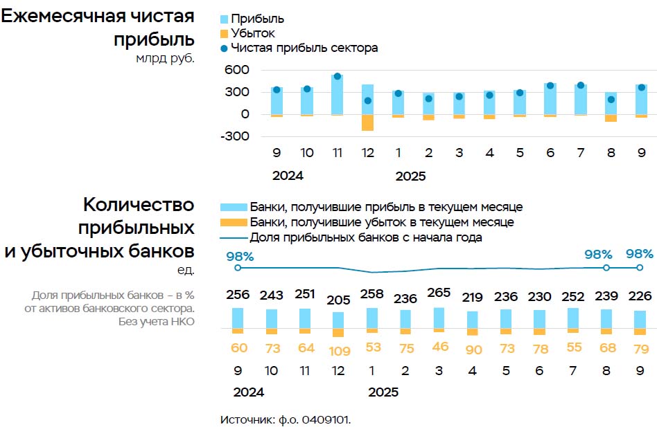 Количество прибыльных банков по итогам 9 месяцев 2025 года составило 226 или 74% от общего числа банков. На долю прибыльных банков приходится 99% активов банковской системы страны, т.е. убыточными оказались в основном небольшие банки. Традиционно почти половина прибыли всего банковского сектора заработана Сбербанком.