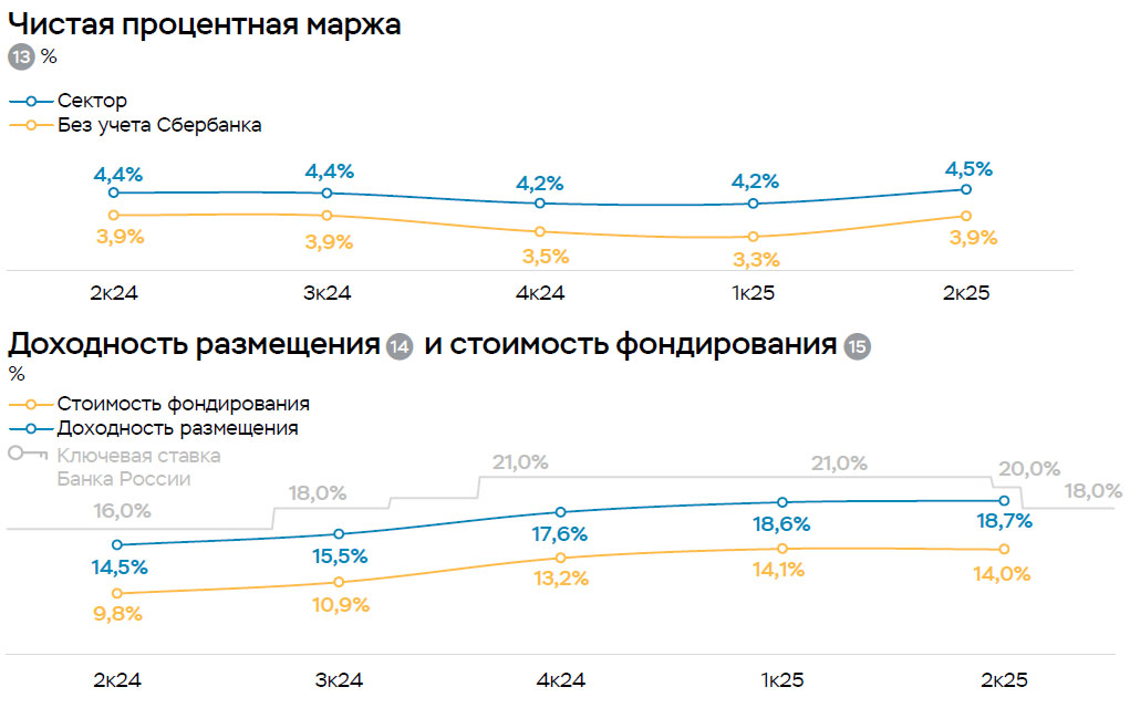 По последним доступным данным, чистая процентная маржа во 2-м квартале 2025 года составила 4,5% годовых. Однако традиционно маржа Сбербанка была выше, чем в целом по банковскому сектору за счет высокой доли дешевого фондирования. Без Сбербанка маржа по сектору составила 3,9% годовых. Минимум маржи сектора пришелся на 1-й квартал 2025 года, это был период с максимально высокими ставками по вкладам. После начала цикла снижения ставок банкам удалось снижать ставки по привлеченным средствам с некоторым опережением, чем снижались ставки по кредитам. В рознице доходность размещения поддерживает высокая доля льготной ипотеки, часть ставки по которой банкам компенсирует государство.