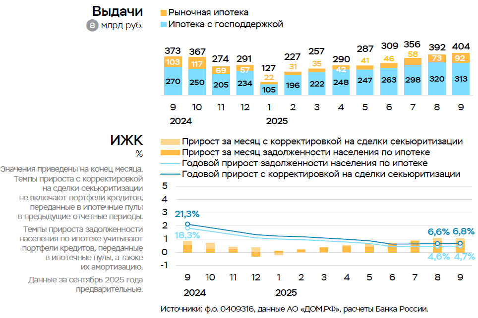 Согласно данным Банка России, за 9 месяцев 2025 года объем задолженности по ипотеке физлиц увеличился всего на 3,7% и составил 22,6 трлн. рублей. Это объясняется снижением доступности льготных ипотечных программ и низким спросом на ипотеку по рыночным ставкам. В объеме выдач 80% приходится на ипотеку с господдержкой, прежде всего – на семейную ипотеку, ставшей самой популярной госпрограммой. В августе месяце на семейную ипотеку приходилось 87% от выдач всей льготной ипотеки. Средняя ставка по рыночной ипотеке составляла в сентябре 21% годовых.