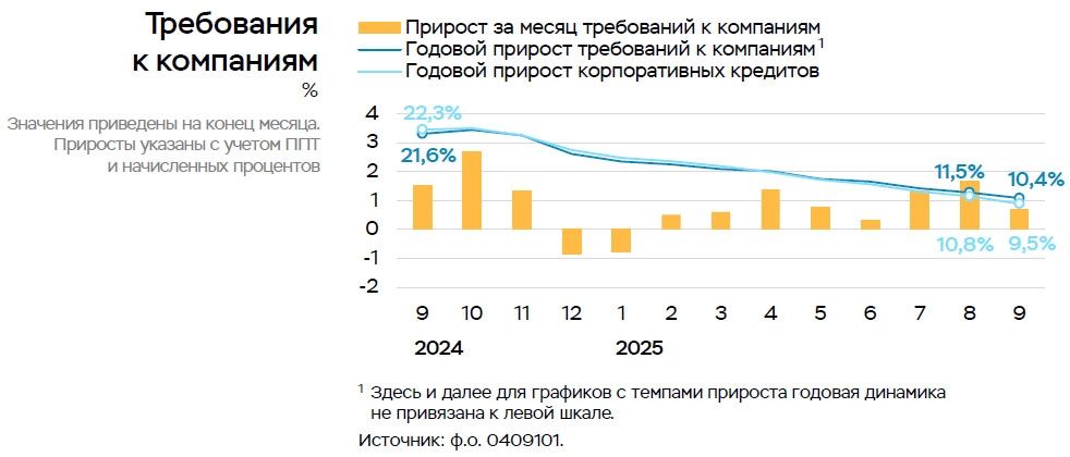 Объем портфеля кредитов юрлицам за 9 месяцев 2025 года возрос на 6,2% и составил 93,1 трлн. рублей. С учетом корпоративных облигаций требования к компаниям достигли 99,3 трлн. рублей.