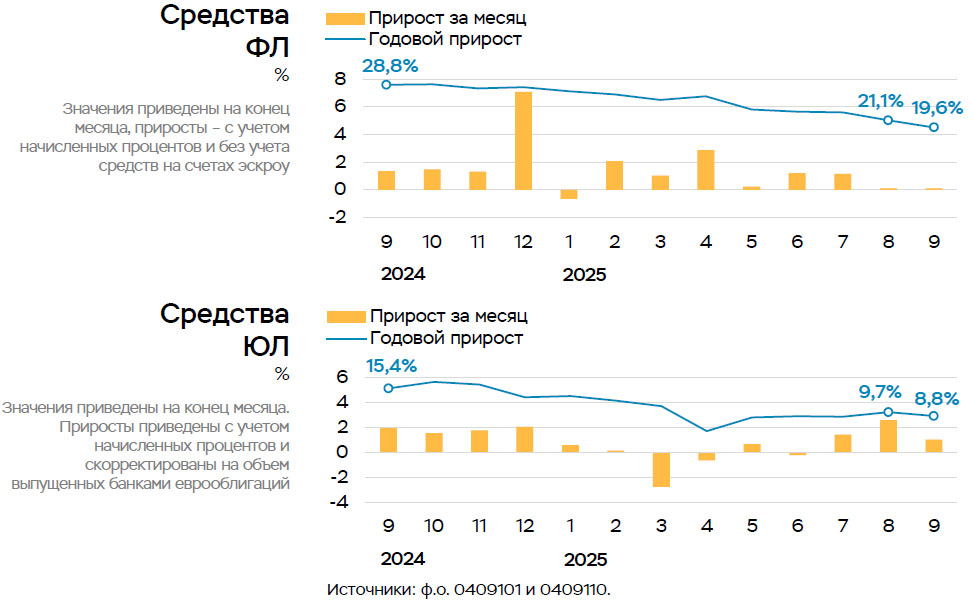 Остаток средств физлиц в банках за 9 месяцев 2025 года возрос на 8,4% и составил 62,7 трлн. рублей. Рост средств произошел в основном на срочных вкладах. Объем вкладов возрос на 8% и составил 43,6 трлн. рублей. В августе и сентябре, после снижения банками ставок по вкладам, рост объемов вкладов сильно замедлился. Важным фактором роста объемов средств частных лиц в банках является капитализация части процентного дохода по вкладам, открытым по высоким ставкам в конце 2024 – начале 2025 года.