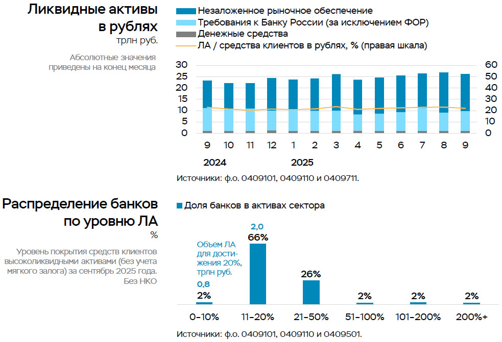 По данным Банка России, запас рублевой и валютной ликвидности в банковской системе страны на конец 9 месяцев 2025 года является достаточным. Покрытие клиентских средств рублевыми ликвидными активами составляет 22%. Но распределен запас ликвидности между банками неравномерно. Запас рублевой ликвидности составил 26 трлн. рублей.