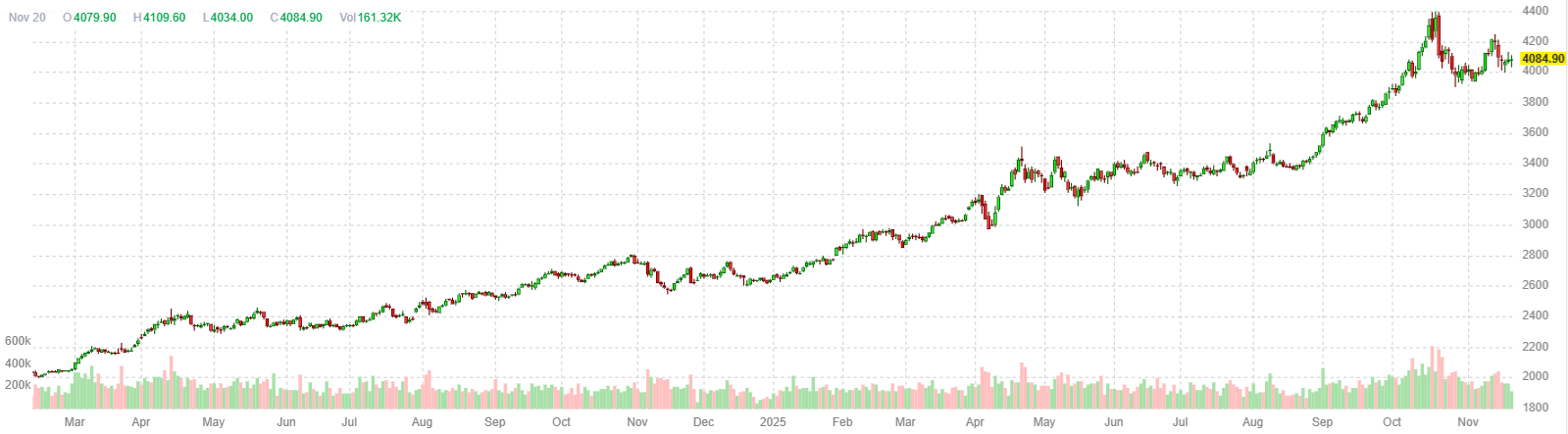 На момент подготовки материала спот-цена на золото выросла на 0,03% — до $4 081,98 за унцию, тогда как фьючерсы на золото в США с поставкой в декабре прибавили 0,05% — до $4 084,90 за унцию.