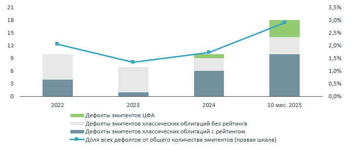 Хотя за истекший период 2025 года уровень дефолтности в целом оказался приемлемым, АКРА обращает внимание на наличие неблагоприятной динамики описанных выше показателей, что, по мнению Агентства, может привести к росту дефолтности в 2026 году. Развитие сегмента ЦФА, особенно при сохранении более низкого качества эмитентов по сравнению с классическими облигациями, может вызвать дополнительное увеличение числа дефолтов в 2026 году.