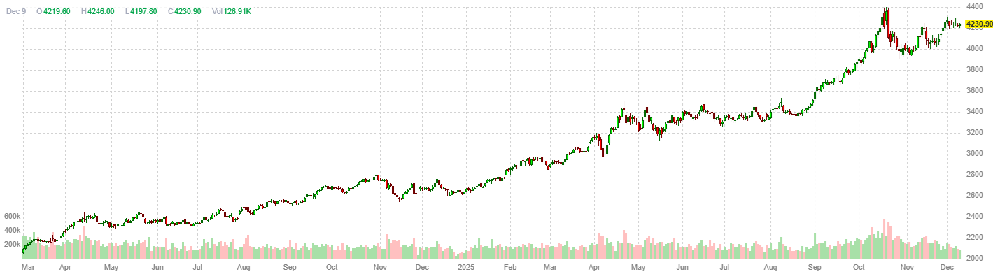На момент подготовки материала спот-цена на золото поднялась на 0,63% — до $4 214,83 за унцию, восстановившись после падения до минимума со 2 декабря, зафиксированного ранее во вторник. Фьючерсы на золото США с февральской поставкой также прибавили 0,31%, достигнув $4 230,90 за унцию.