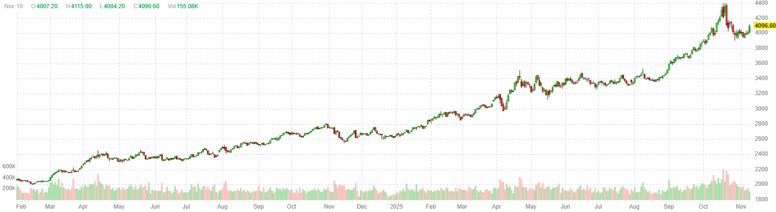 Несмотря на недавний откат на 6% от рекордного уровня выше $4 380 за унцию, достигнутого 16 октября, золото остаётся в плюсе более чем на 50% с начала года. Основные драйверы ралли — экономическая и геополитическая неопределённость, а также активные покупки со стороны центробанков — сохраняются. Народный банк Китая, один из крупнейших покупателей, увеличил золотые резервы в октябре — уже 12-й месяц подряд. Золотые биржевые фонды также зафиксировали чистый приток средств в последние две торговые сессии.