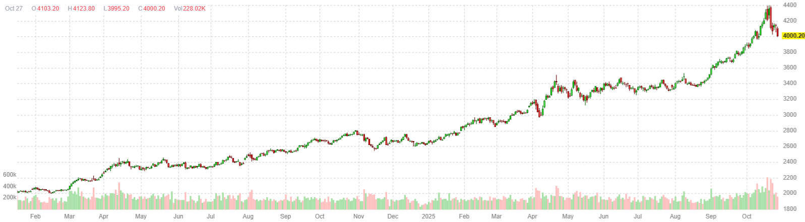 На момент подготовки материала спот-котировки снижались на 3,0%, до $3986,95 за унцию. Впервые с 9 октября золото оказалось ниже $4000. Декабрьские фьючерсы теряли 3,3%, торгуясь на уровне $4000,20.