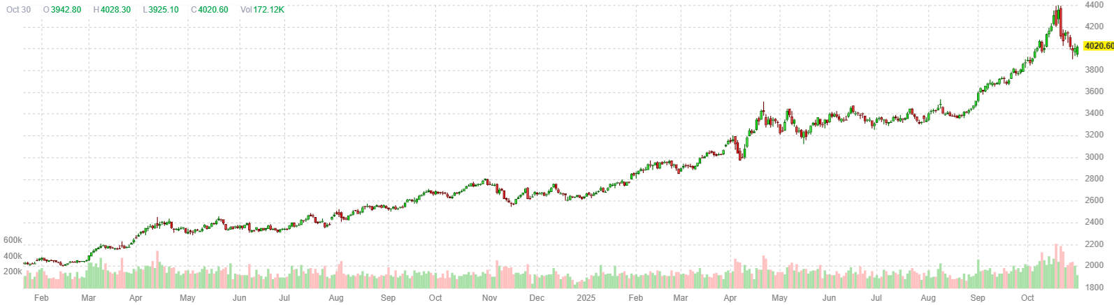 Спот-цена прибавила 1,6%, до $3993,27 за унцию, а декабрьские фьючерсы — 0,5%, до $4020,60.