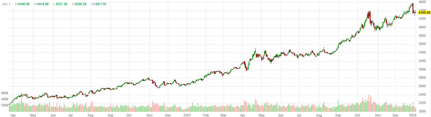 На момент подготовки материала спот-цена на золото выросла на 0,37% и достигла $4 330,14 за унцию, после того как ранее в течение дня рост превышал 1,7%. В среду, в последний день 2025 года, котировки опустились до двухнедельного минимума на фоне фиксации прибыли. 26 декабря золото обновило исторический максимум на уровне $4 549,71.