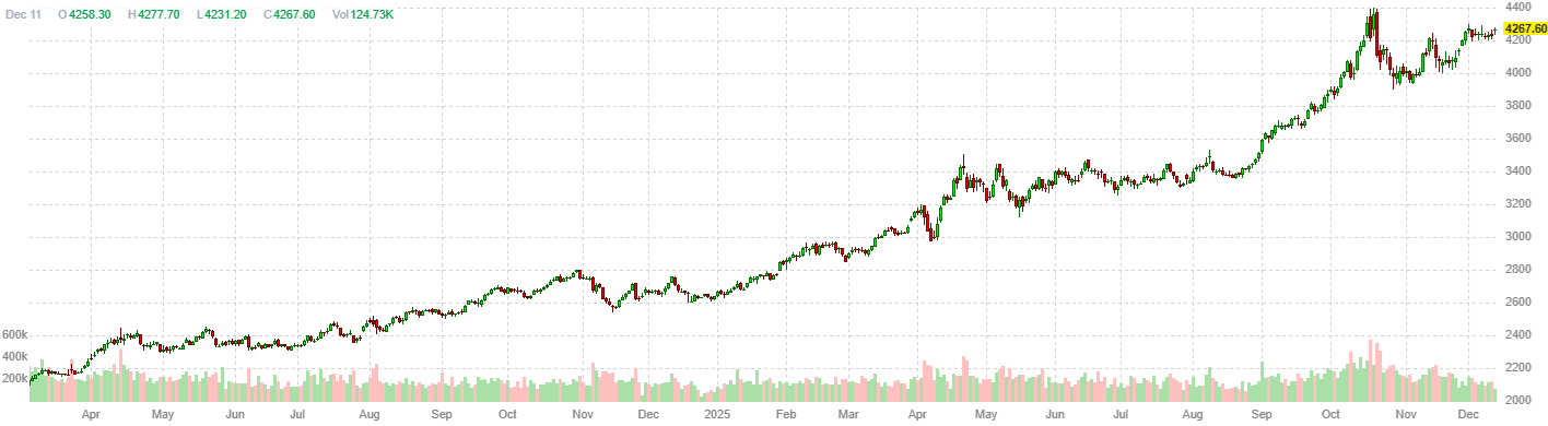 На момент подготовки материала спот‑цена золота выросла на 0,40% до $4 244,72 за унцию, восстановившись после утреннего снижения. Фьючерсы на золото в США с поставкой в феврале прибавили 1,02% до $4 267,60 за унцию.