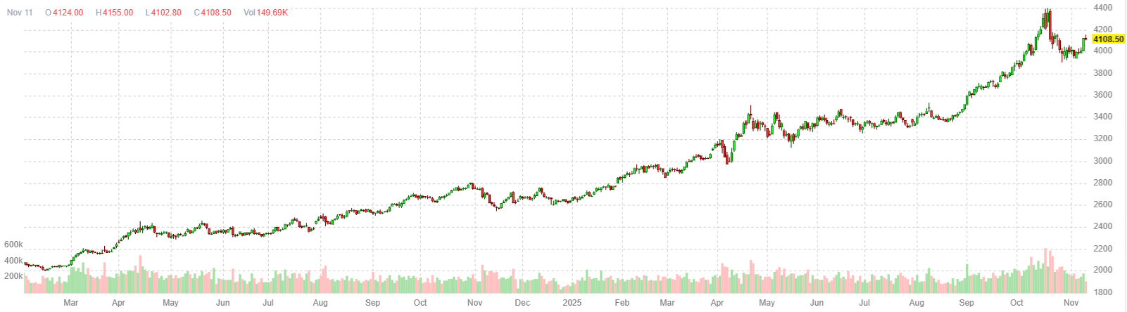 В понедельник золото зафиксировало самый сильный дневной рост с мая: котировки подскочили на 2,9%, до уровня около $4 140 за унцию — на фоне новостей о достижении соглашения по завершению шатдауна.