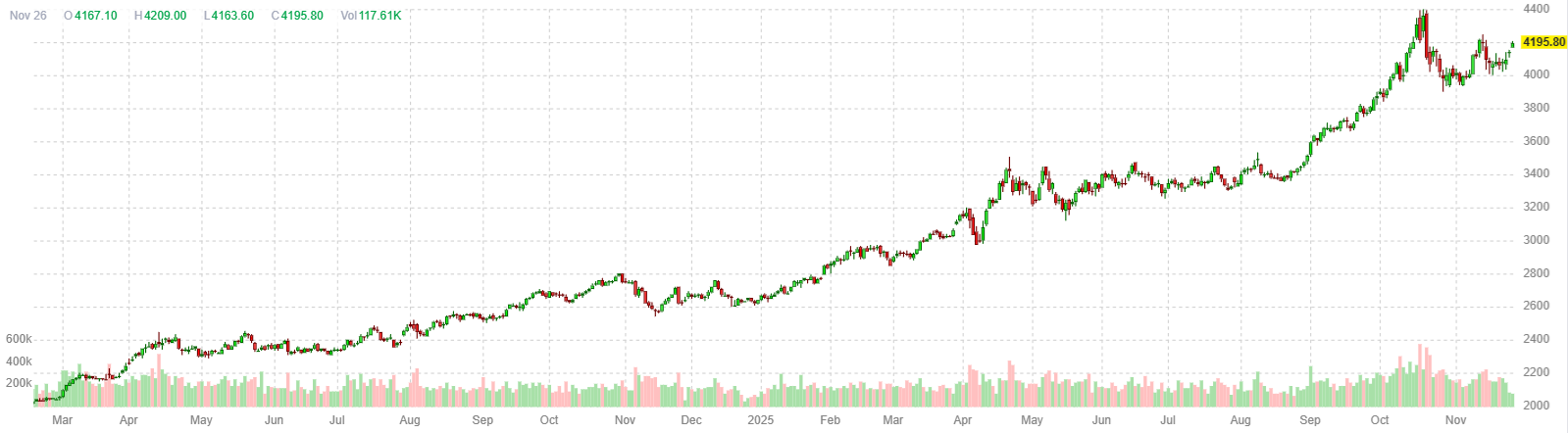 Драгметалл закрепился выше отметки $4 000 за унцию после отката от октябрьского максимума выше $4 380. Золото демонстрирует лучшую годовую динамику с 1979 года, прибавив более 55% благодаря покупкам центробанков и устойчивому спросу со стороны розничных инвесторов.