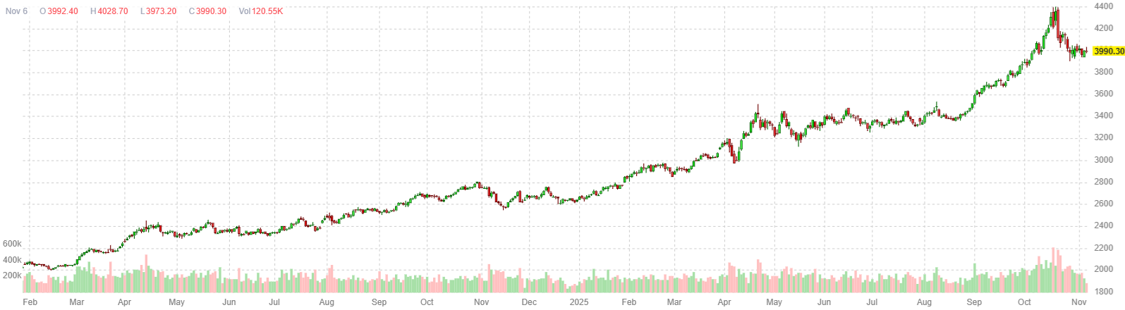 На момент подготовки материала спот-цена на золото выросла на 0,01% до $3 982,64 за унцию, декабрьские фьючерсы — на 0,07% до $3 990,30.
