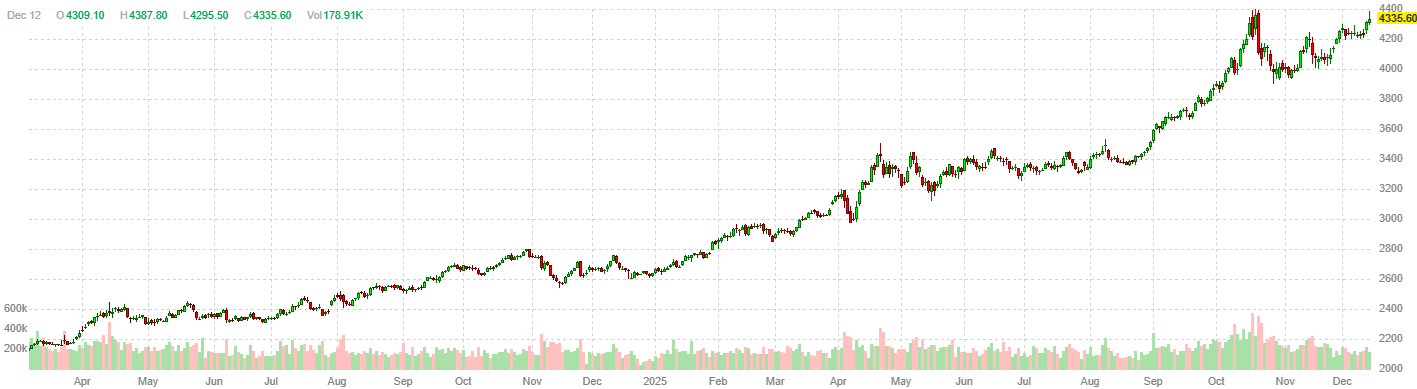 На момент подготовки материала спот‑цена золота выросла на 0,79% до $4 313,16, немного скорректировавшись после подъёма к максимуму с 21 октября; металл готов завершить неделю ростом почти на 3%. Фьючерсы на золото в США прибавили 0,52% до $4 335,60 и движутся к недельному приросту более чем на 2,2%.